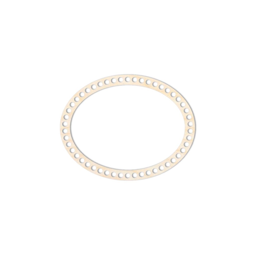 Anello di rinforzo per coperchio ovale di dimensioni 20 x 15 cm, realizzato in compensato di betulla spessore 3 mm, ideale per la creazione di cestini all'uncinetto con filati tipo fettuccia o corda.