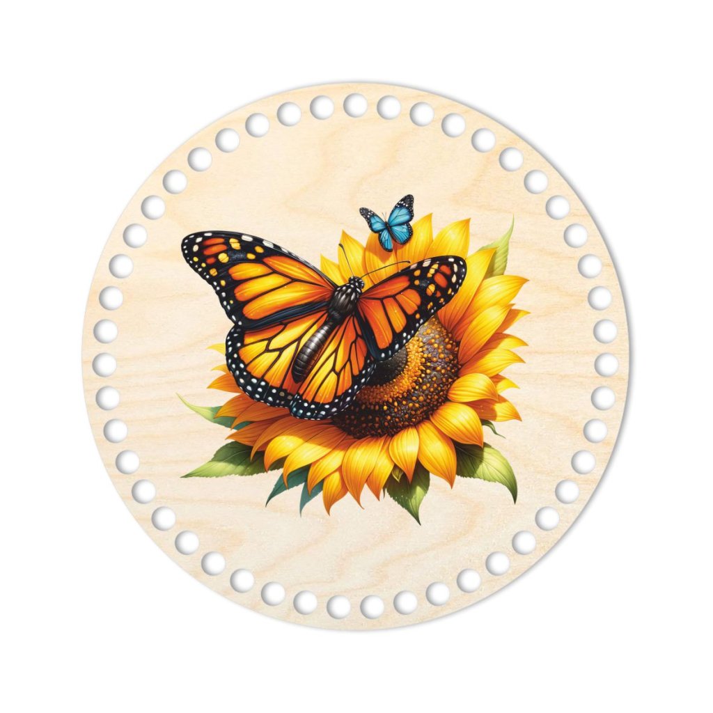 Questo ritaglio circolare in compensato di betulla è la scelta ideale per gli amanti dell'uncinetto che desiderano creare cestini con un autentico aspetto naturale. Con un diametro di 20 cm e un materiale spesso 3 mm, fornisce una base solida per i tuoi cestini fatti a mano. La sua superficie è impreziosita da un bellissimo motivo di una farfalla posata su un fiore di girasole, applicato tramite stampa UV per colori duraturi e resistenza allo sbiadimento. Questo metodo di stampa garantisce che il motivo rimanga vivido e pulito anche con un uso frequente.