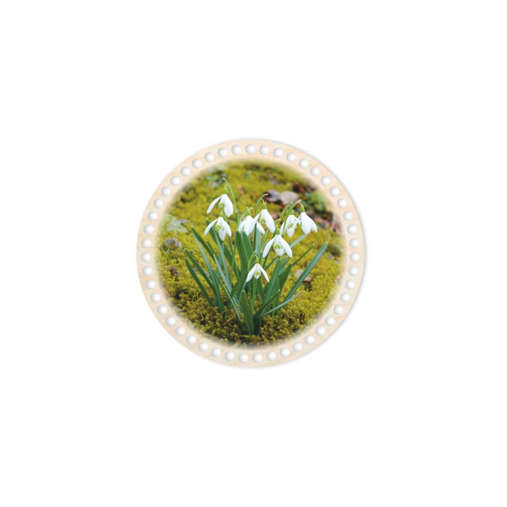 Coperchio con motivo primaverile a bucaneve per cestini realizzati con filati a spaghetti. Il motivo è stampato con stampante UV su coperchio in compensato di betulla.