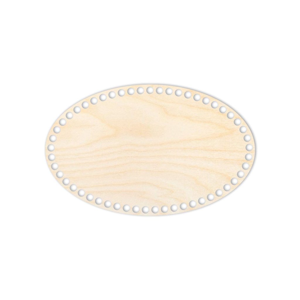 Base ovale in legno, nelle dimensioni 40 x 25 cm, realizzato in compensato di betulla di 3 mm di spessore, adatto per la realizzazione di cesti all'uncinetto con filati di spago o cordoncino dello spessore di 9 mm, i cosiddetti filati JUMBO. Il cesto realizzato può essere utilizzato come decorazione o come contenitore.