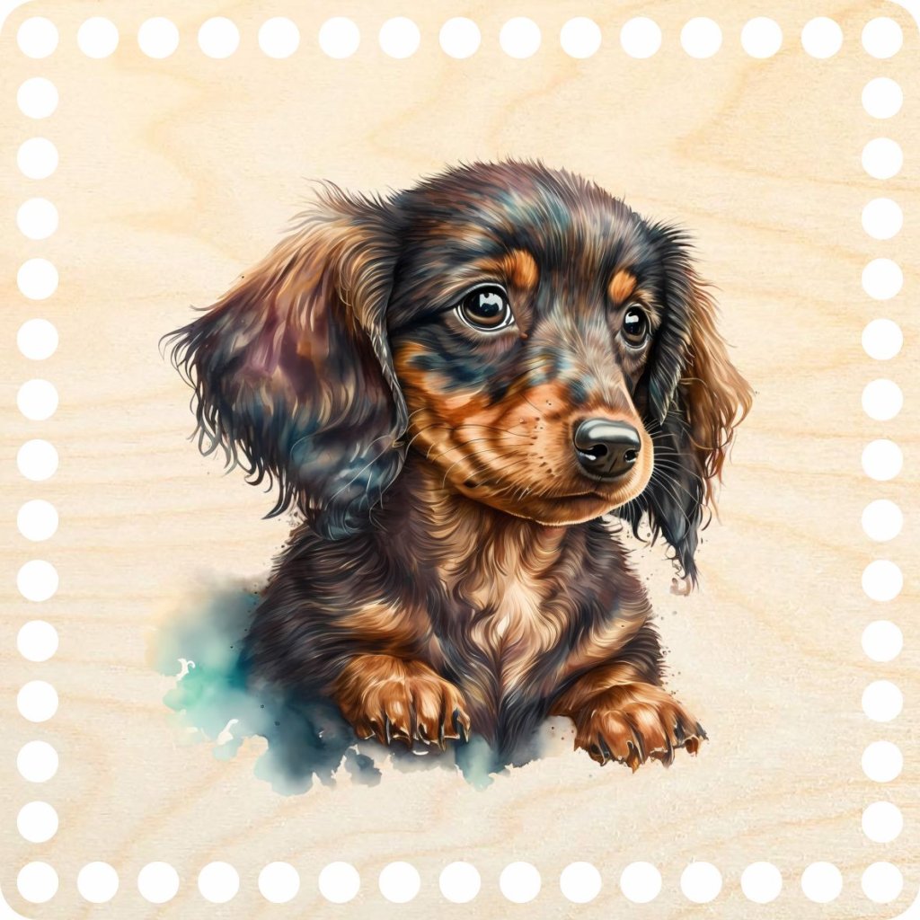 Coperchio con motivo "Bassotto" per cestini realizzati con filati a spaghetto. Il motivo è stampato con stampante UV su un coperchio di compensato di betulla.