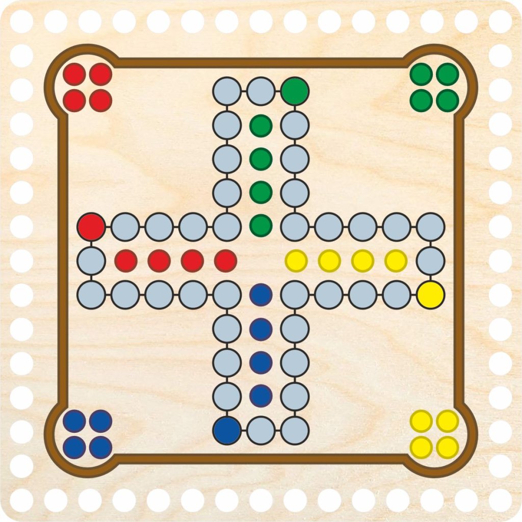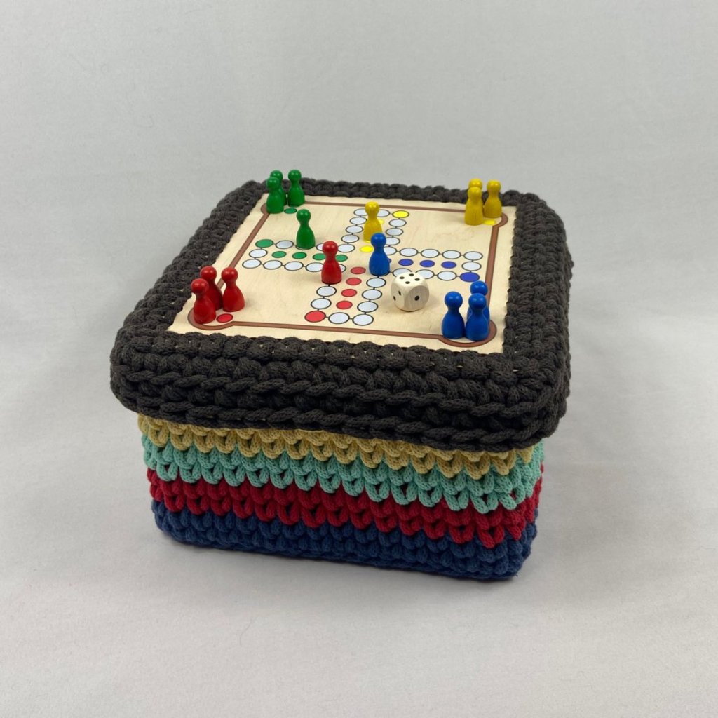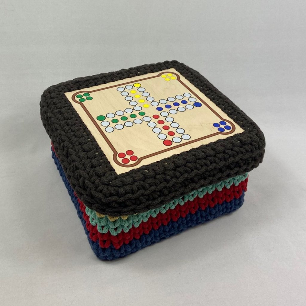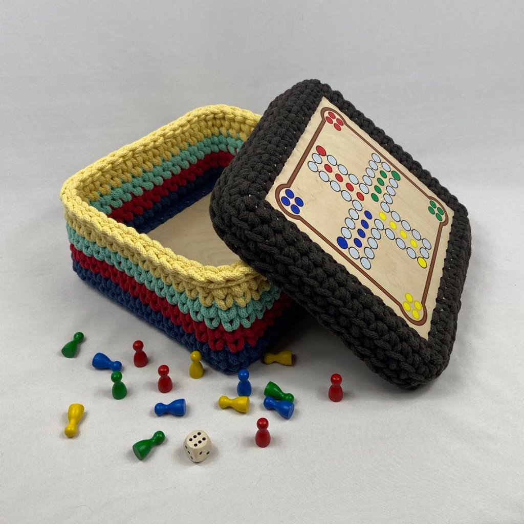 Coperchio con il motivo del gioco "Non t'arrabbiare" per cesti realizzati con filati a nastro. Il motivo è stampato con una stampante UV sul coperchio in compensato di betulla. Nel nostro e-shop, potete acquistare separatamente per questo coperchio anche un set di pedine con dado.