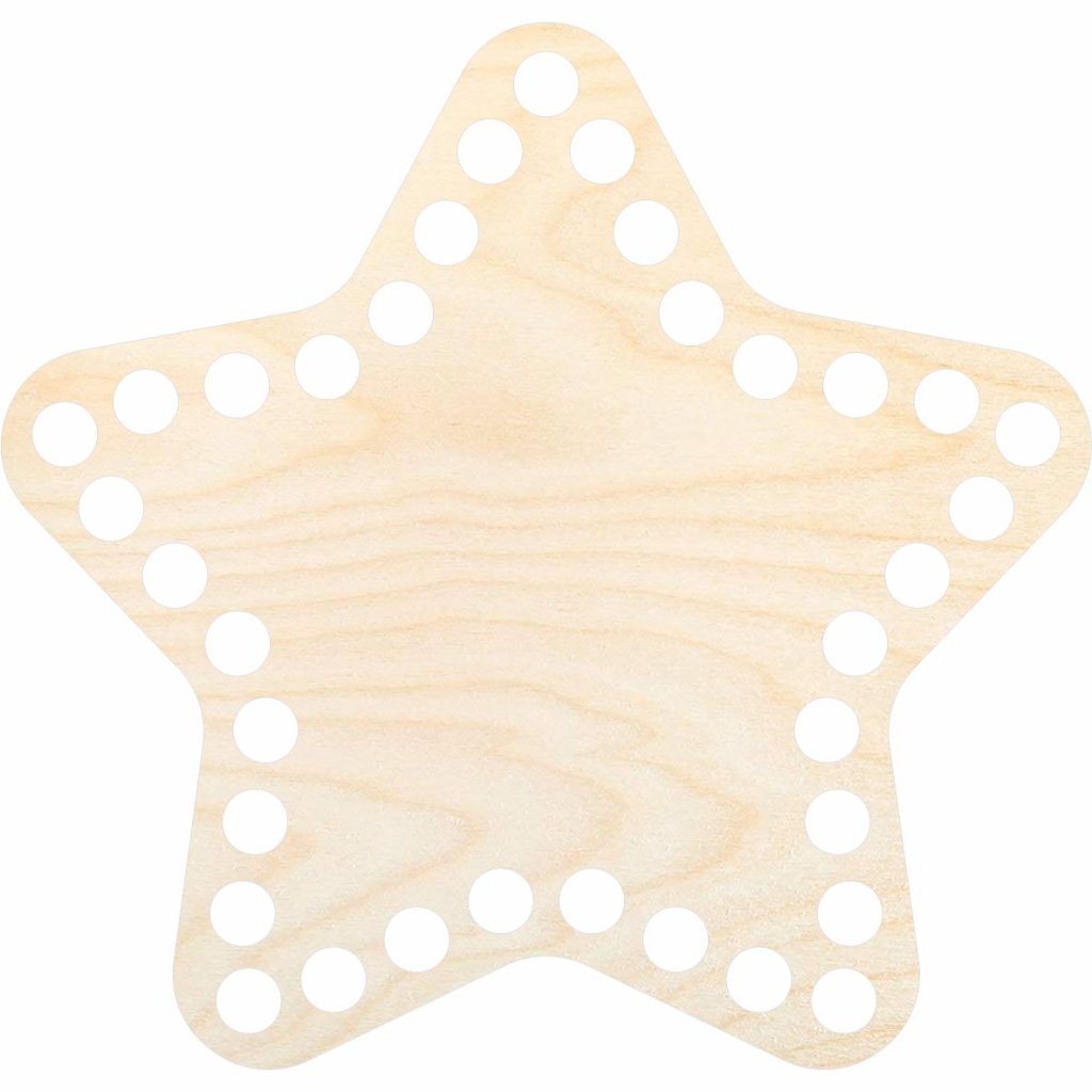 Base a forma di stella in compensato di betulla da 3 mm, ideale per realizzare cestini all'uncinetto con filati tipo fettuccia o cordoncino. Il cestino finito può essere usato come decorazione o come contenitore.