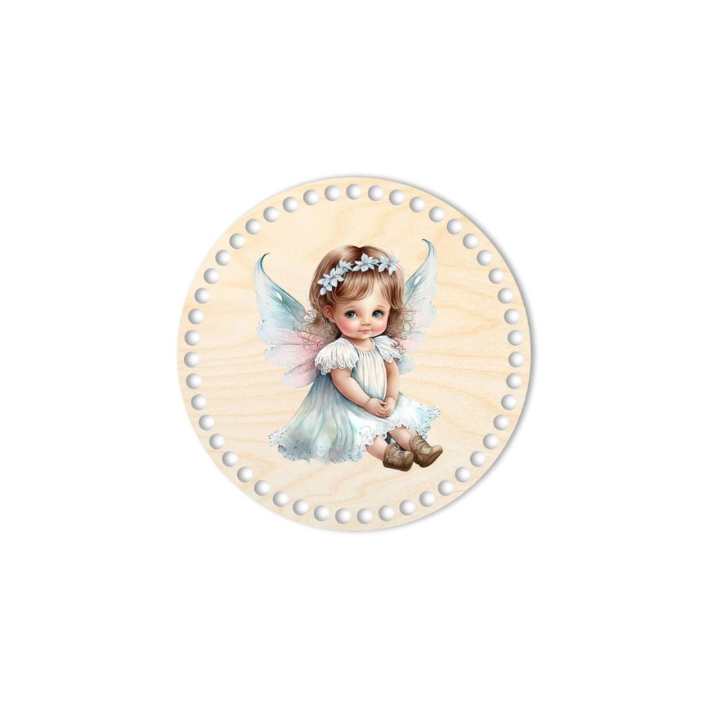 Coperchio con motivo "Angioletto" per cestini realizzati con filati a spaghetto. Il motivo è stampato con stampante UV su coperchio in compensato di betulla.