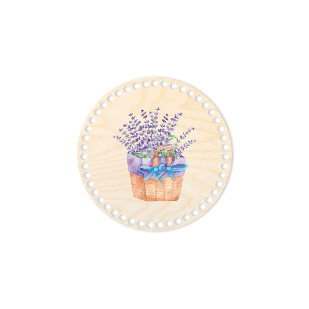 Coperchio con motivo a cesto di lavanda per cestini realizzati con filati tubolari. Il motivo è stampato con stampante UV su un coperchio di compensato di betulla.