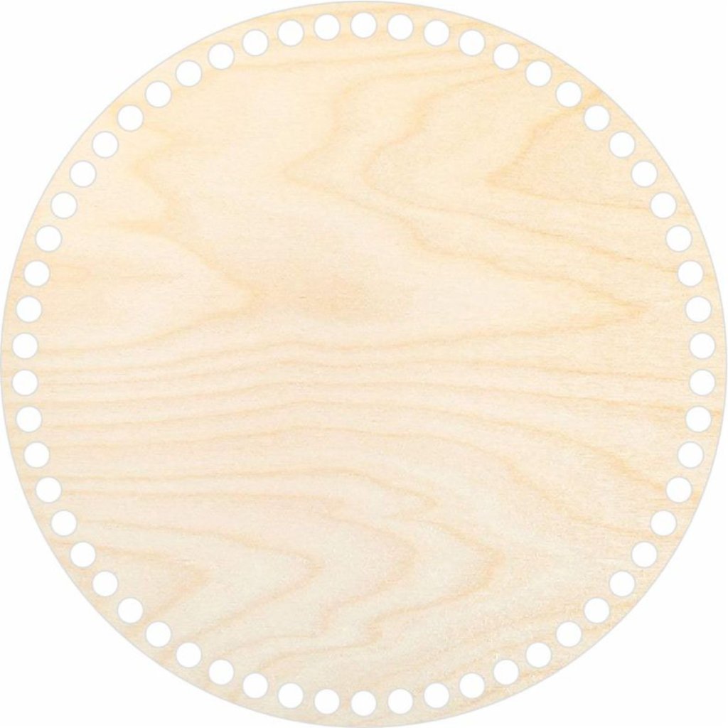 Base rotonda in legno di 25 cm di diametro, realizzata in compensato di betulla spesso 3 mm, ideale per la creazione di cestini all'uncinetto con filati di spago o cordoncino. Il cestino realizzato può essere utilizzato come decorazione o contenitore.