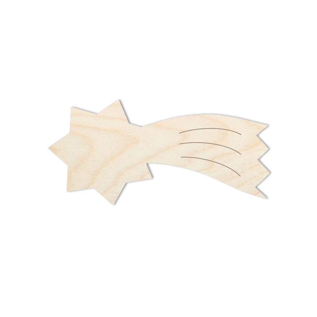 Cometa di legno delle dimensioni di 4 x 2 cm, tagliata da compensato di betulla con uno spessore di 3 mm. Il prodotto è non trattato in superficie, adatto per decorare ulteriormente prodotti finiti o come decorazione. Per la colorazione, si consiglia di utilizzare vernici acriliche.