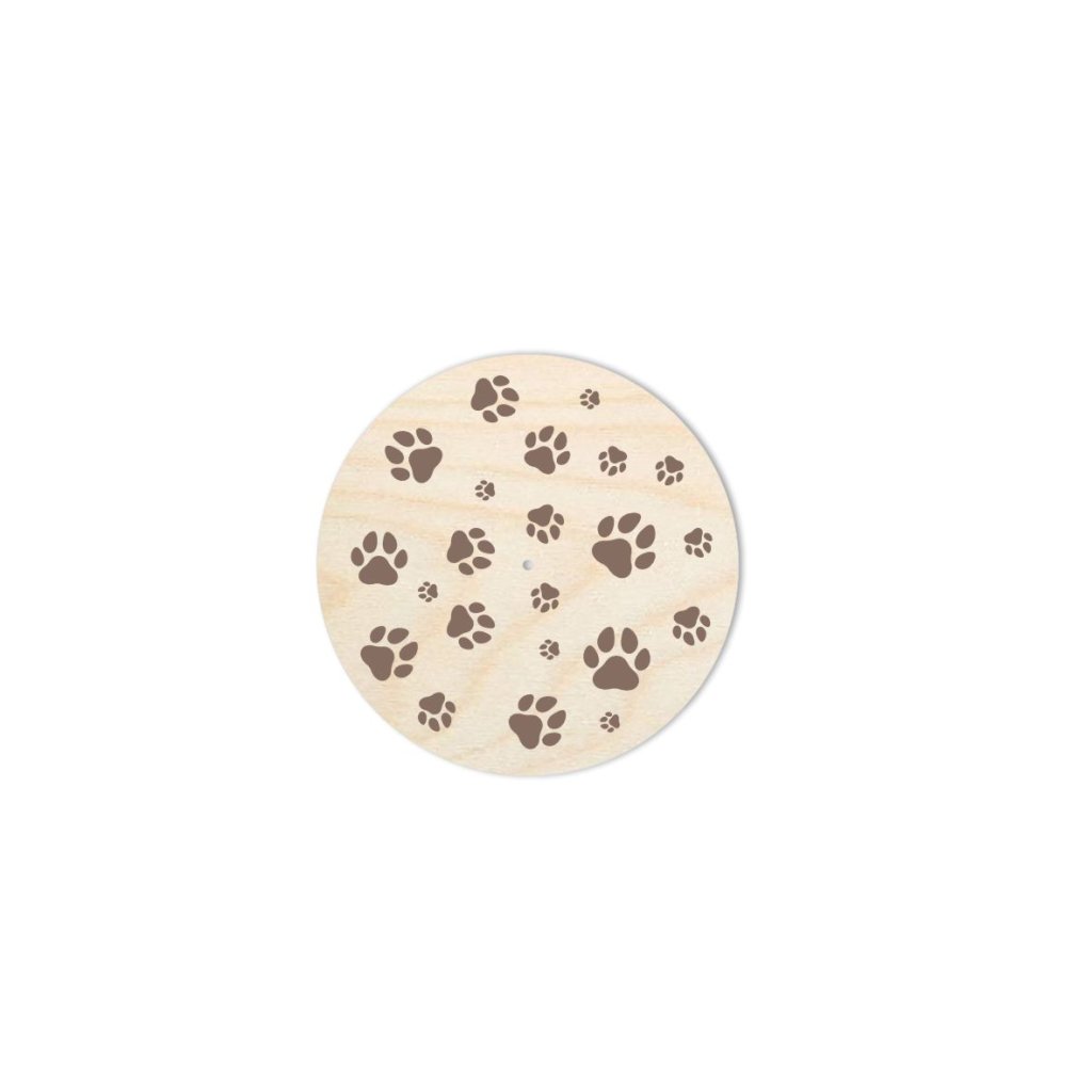 Coperchio con motivo "Impronte di zampe di cane" per cestini realizzati con filati spaghetti. Il motivo è stampato con stampante UV sul coperchio in compensato di betulla.