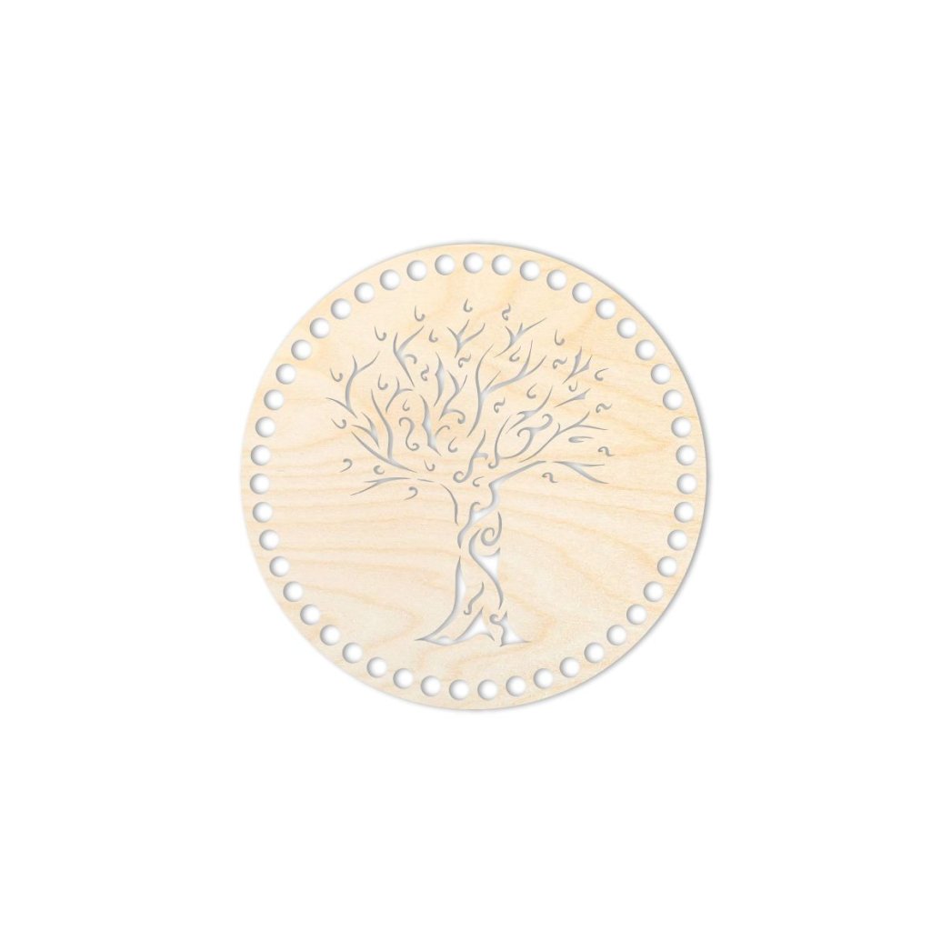 Coperchio con motivo albero della vita per cestini realizzati con filati di fettuccia. Il motivo è tagliato con tecnologia laser su un coperchio di compensato di betulla.
