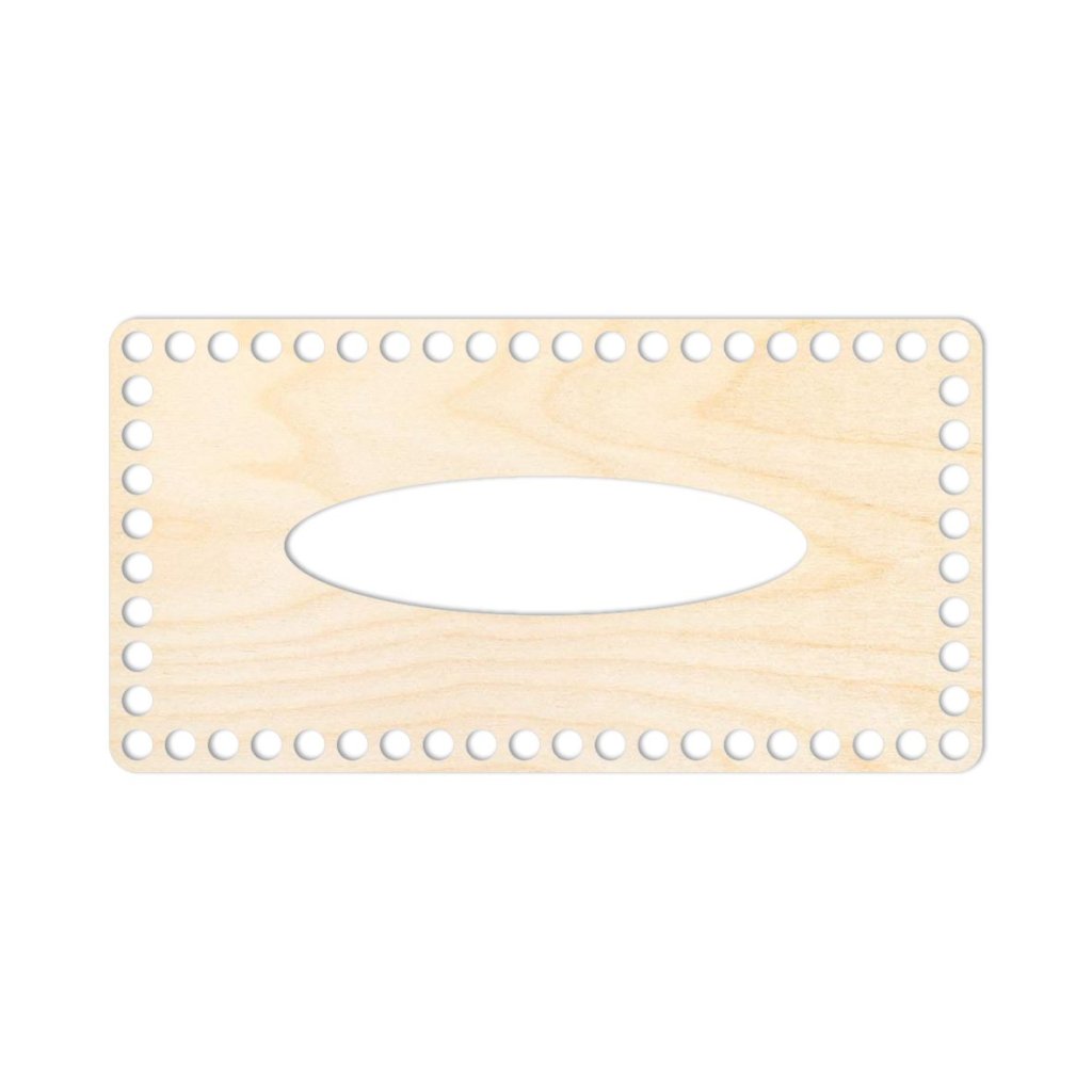 Coperchio in legno per la realizzazione di una custodia all'uncinetto per fazzoletti con filati tipo spaghetti.