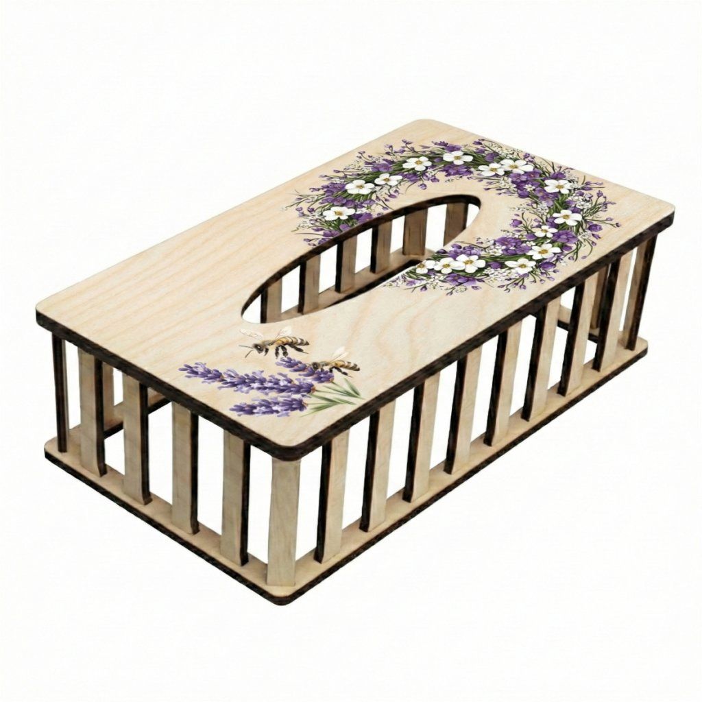La struttura rettangolare in compensato di betulla naturale con una splendida stampa UV colorata di api operose e lavanda profumata è progettata per uno scarto facile e veloce. Creerà una decorazione robusta ed elegante che si infila semplicemente sopra una semplice scatola di carta velina del negozio.