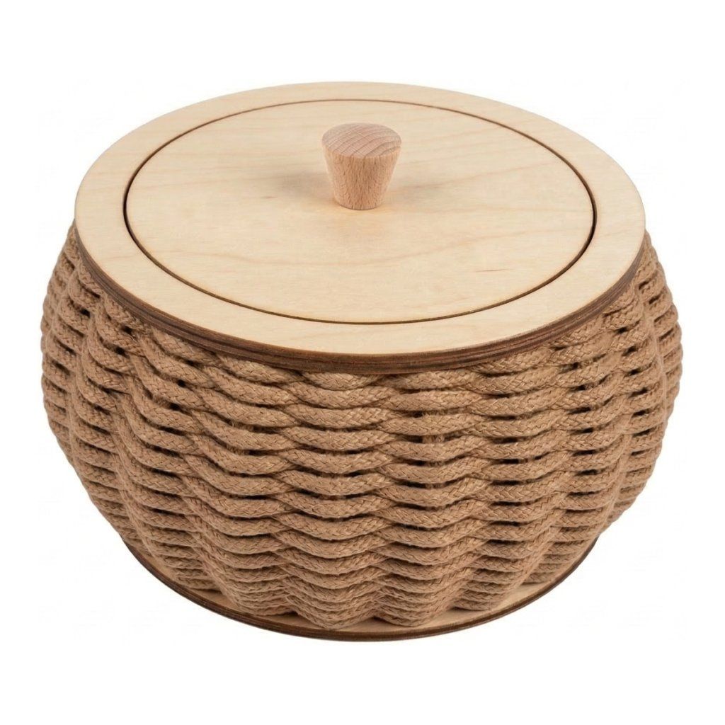 Il SET per cestino "panciuto" è adatto anche per i principianti assoluti. Si consiglia di incollare la struttura con colla o pistola a caldo (vedi video tutorial). Puoi intrecciare con filati e materiali diversi, ma a noi piace di più con il filato Woody da 5 mm.