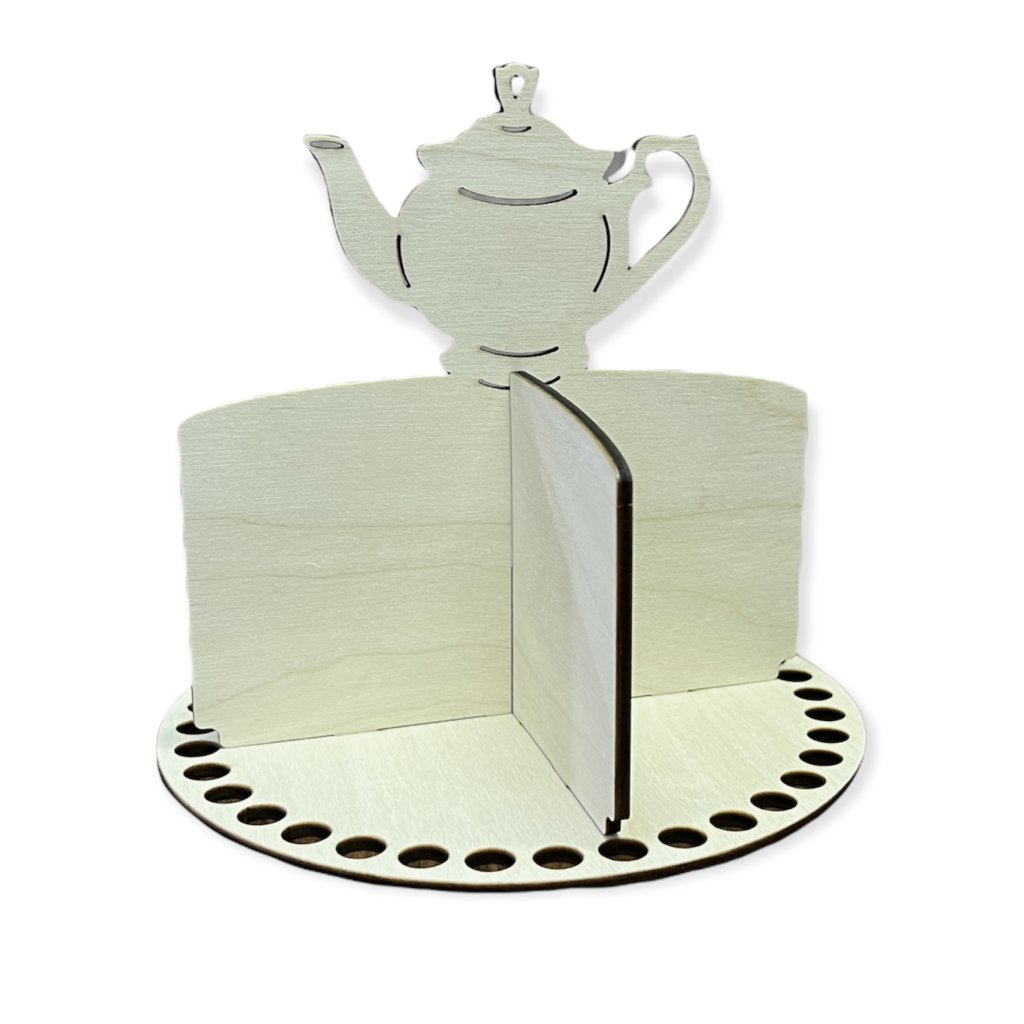 Base rotondo con diametro di 16 cm, realizzato in compensato di betulla di 3 mm di spessore, con una sovrastruttura per la realizzazione di un cestino per bustine di tè. Il cestino realizzato è adatto come accessorio per la casa. La versione è senza scritta.