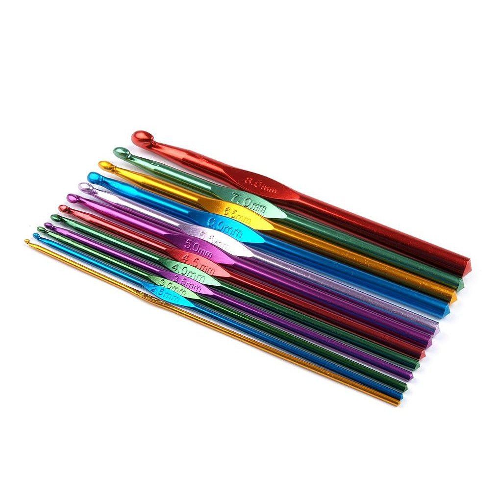 In un set troverete 12 uncinetti in alluminio nelle seguenti misure: 2; 2,5; 3; 3,5; 4; 4,5; 5; 5,5; 6; 6,5; 7 e 8 mm. Gli uncinetti sono in vari colori. Questo assortimento sarà apprezzato da ogni donna che ama l'uncinetto.