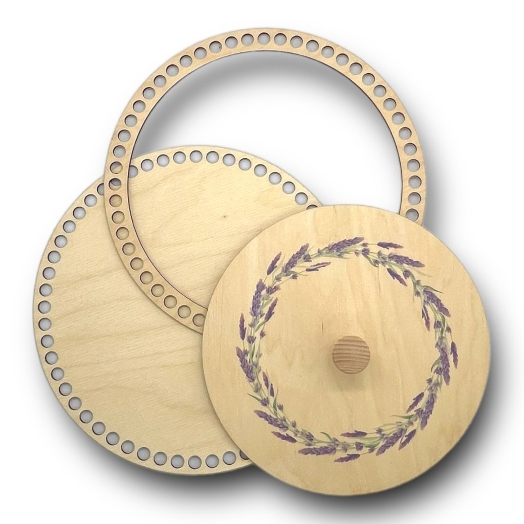 Kit per la realizzazione di un cestino all'uncinetto con anello di rinforzo e un coperchio elegante. Creerai così un cestino robusto, che avrà, grazie all'anello di rinforzo, un bordo solido su cui il coperchio di legno si adatterà facilmente.