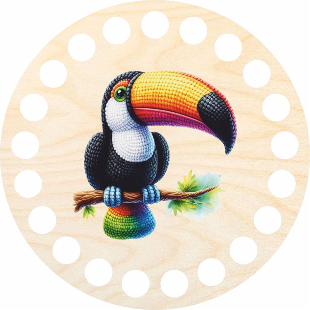 Questo Base circolare in compensato di betulla di 10 cm di diametro con un motivo di tucano all'uncinetto è una base solida per sottobicchieri all'uncinetto, ma può anche essere utilizzato come base o coperchio elegante.