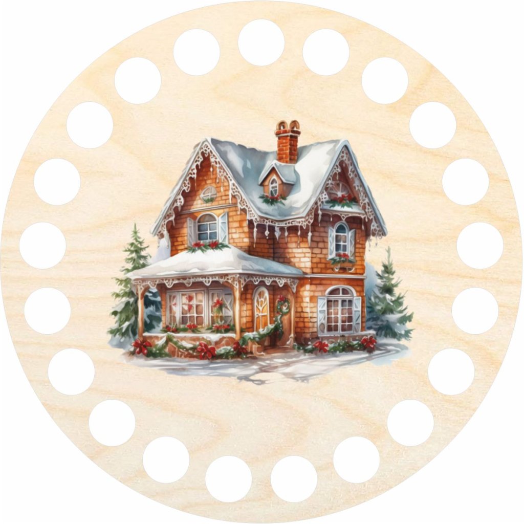 Coperchio per cestini realizzati con filati a spaghetto. Può essere utilizzato anche per realizzare sottobicchieri. Il motivo è stampato con una stampante UV su un coperchio di compensato di betulla.