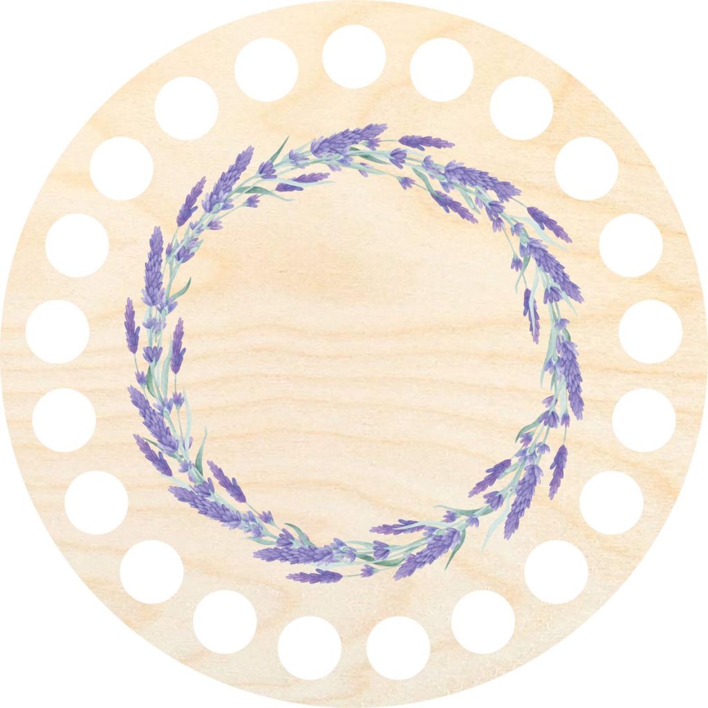 Coperchio per cestini realizzati con filati a spaghetto. Può essere utilizzato anche per la creazione di sottobicchieri. Il motivo è stampato con una stampante UV sul coperchio in compensato di betulla.