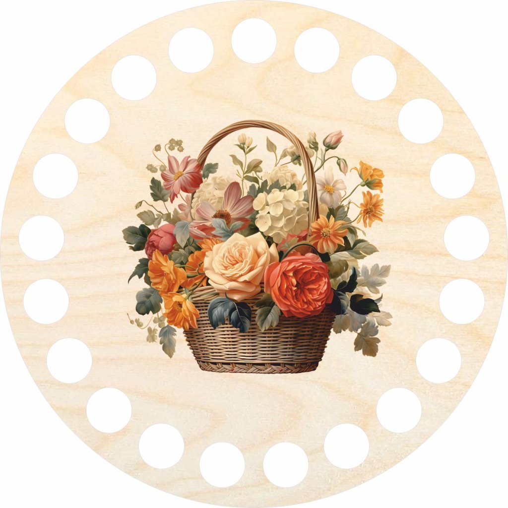 Coperchio per cestini realizzati con filati di fettuccia. Può essere utilizzato anche per la creazione di sottobicchieri. Il motivo è stampato con una stampante UV sul coperchio in compensato di betulla.