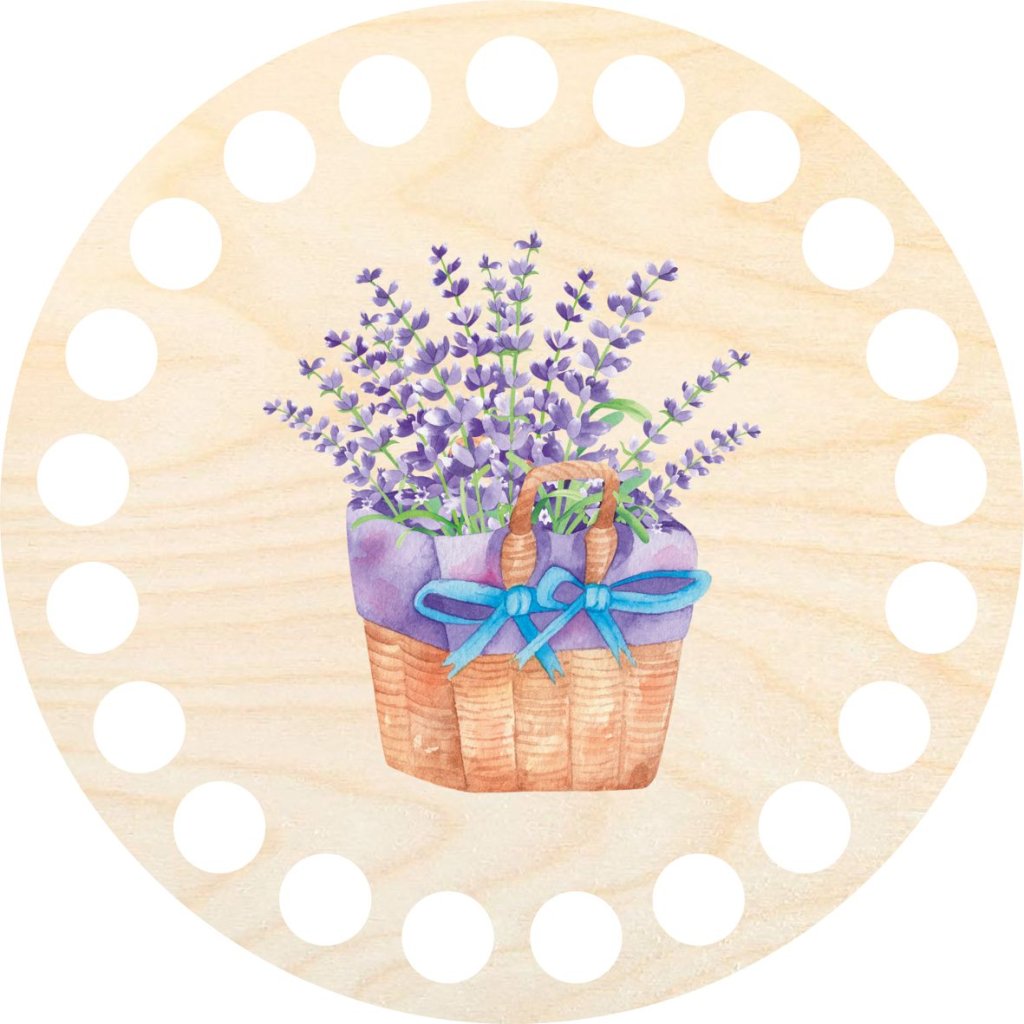 Coperchio per cestini realizzati con filati a spaghetti. Può essere utilizzato anche per la creazione di sottobicchieri. Il motivo è stampato con una stampante UV sul coperchio in compensato di betulla.