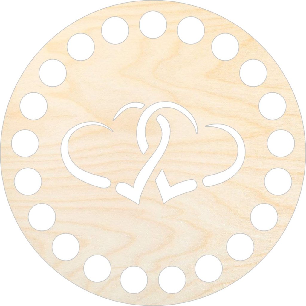 Coperchio per cestini realizzati con filati di fettuccia con motivo di due cuoricini. Il motivo è intagliato nel coperchio in compensato di betulla.