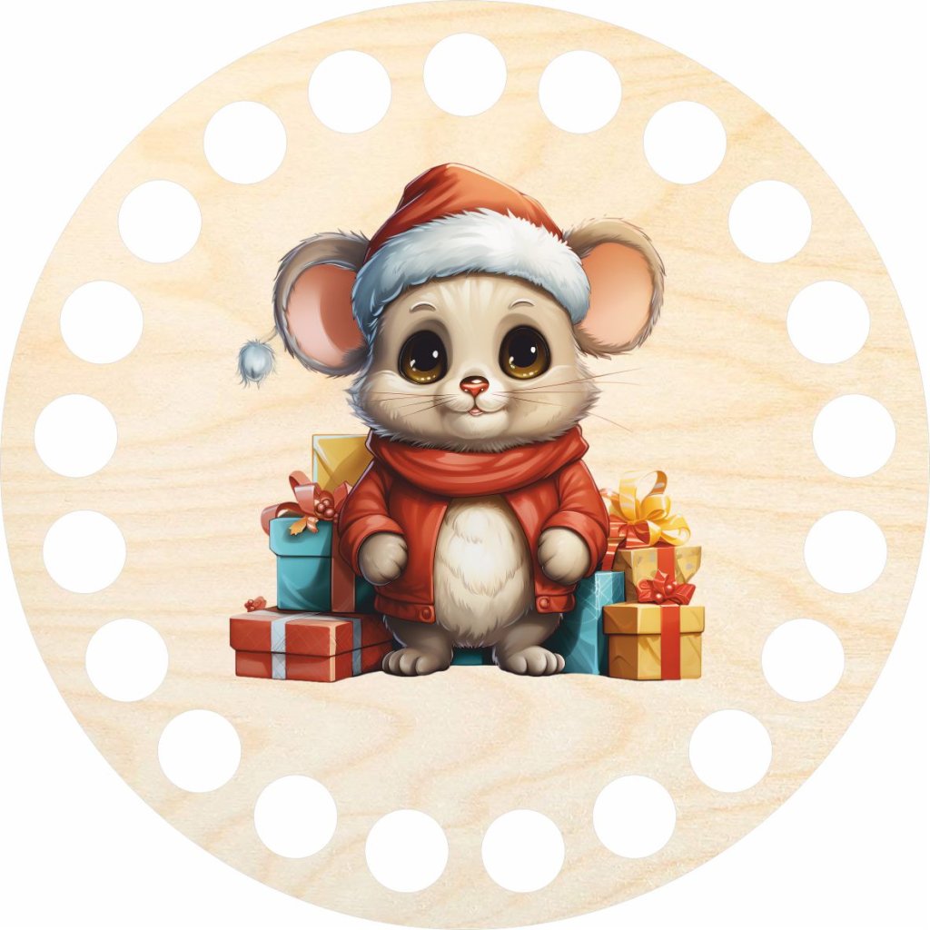 Coperchio per cestini realizzati con filati a spaghetto. Può essere utilizzato anche per realizzare sottobicchieri. Il motivo è stampato con una stampante UV sul coperchio in compensato di betulla.