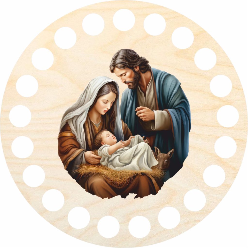 Coperchio per cestini realizzati con filati a spaghetti. Può essere utilizzato anche per realizzare sottobicchieri. Il motivo è stampato con stampante UV sul coperchio in compensato di betulla.