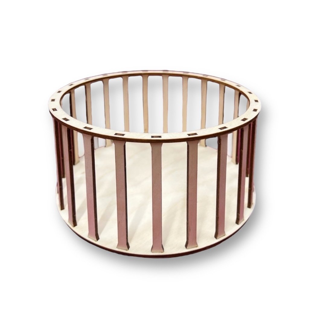 Struttura circolare per un cesto intrecciato con un diametro di 25 cm e un'altezza di 10 cm, realizzata in compensato di betulla di alta qualità. Questo set include un Base, dei montanti e un anello superiore per una facile creazione, anche per i principianti.